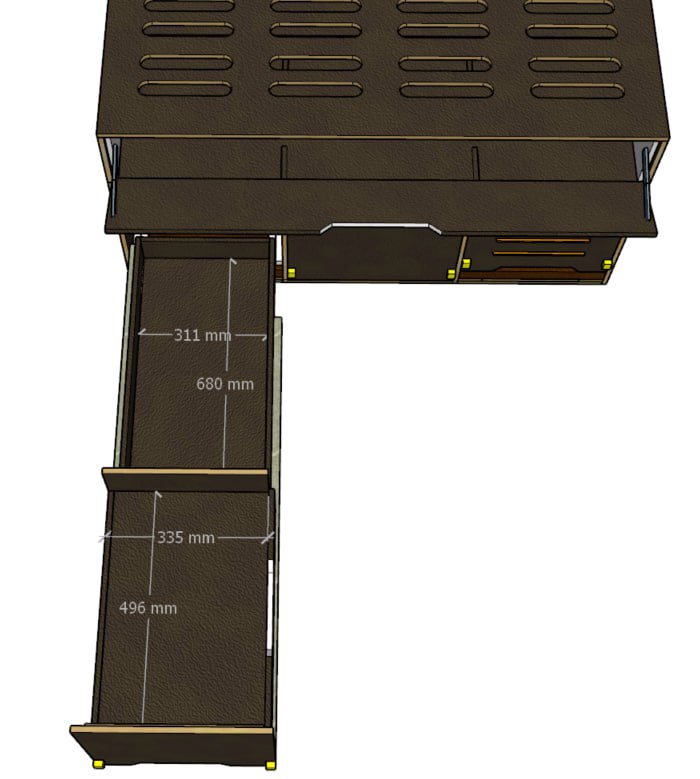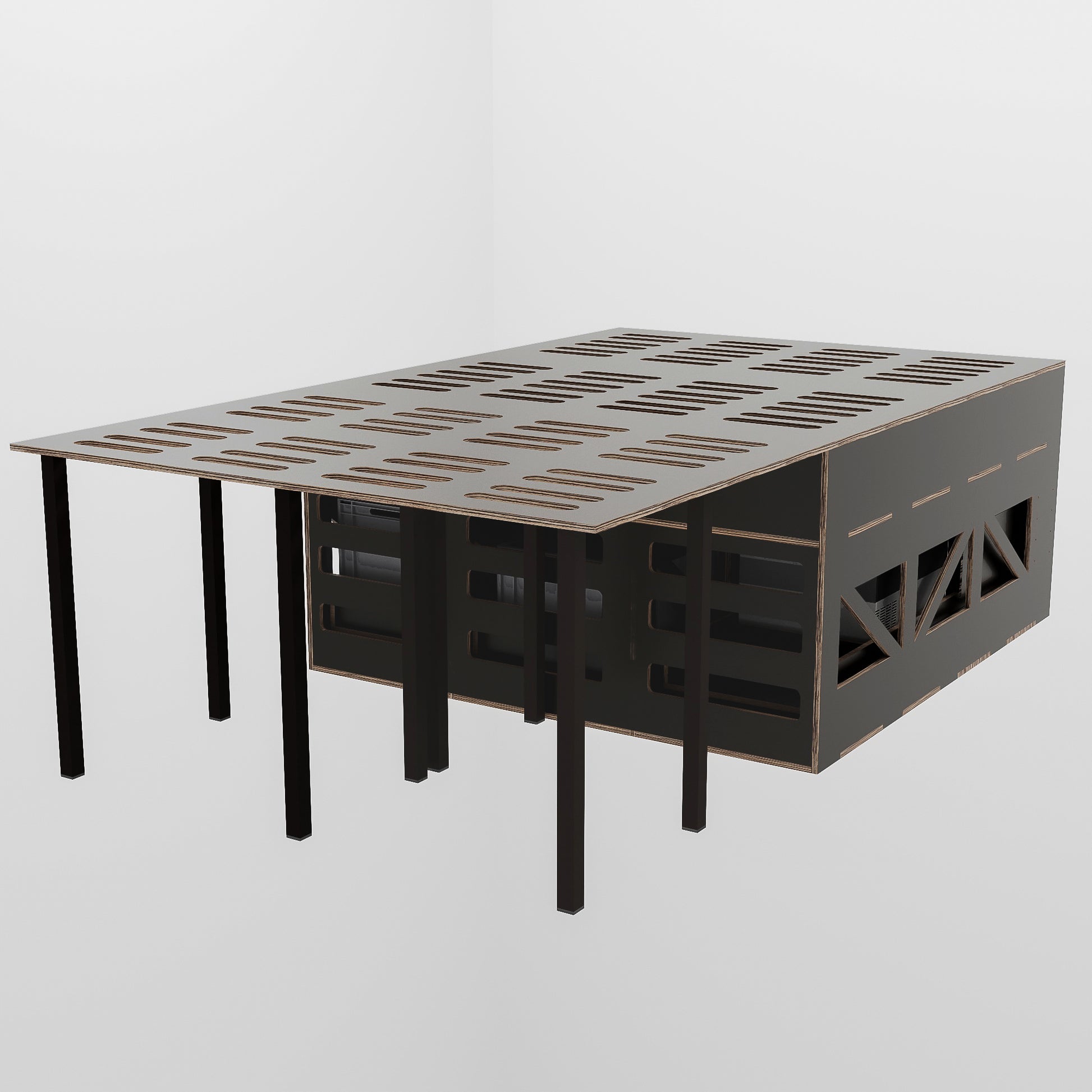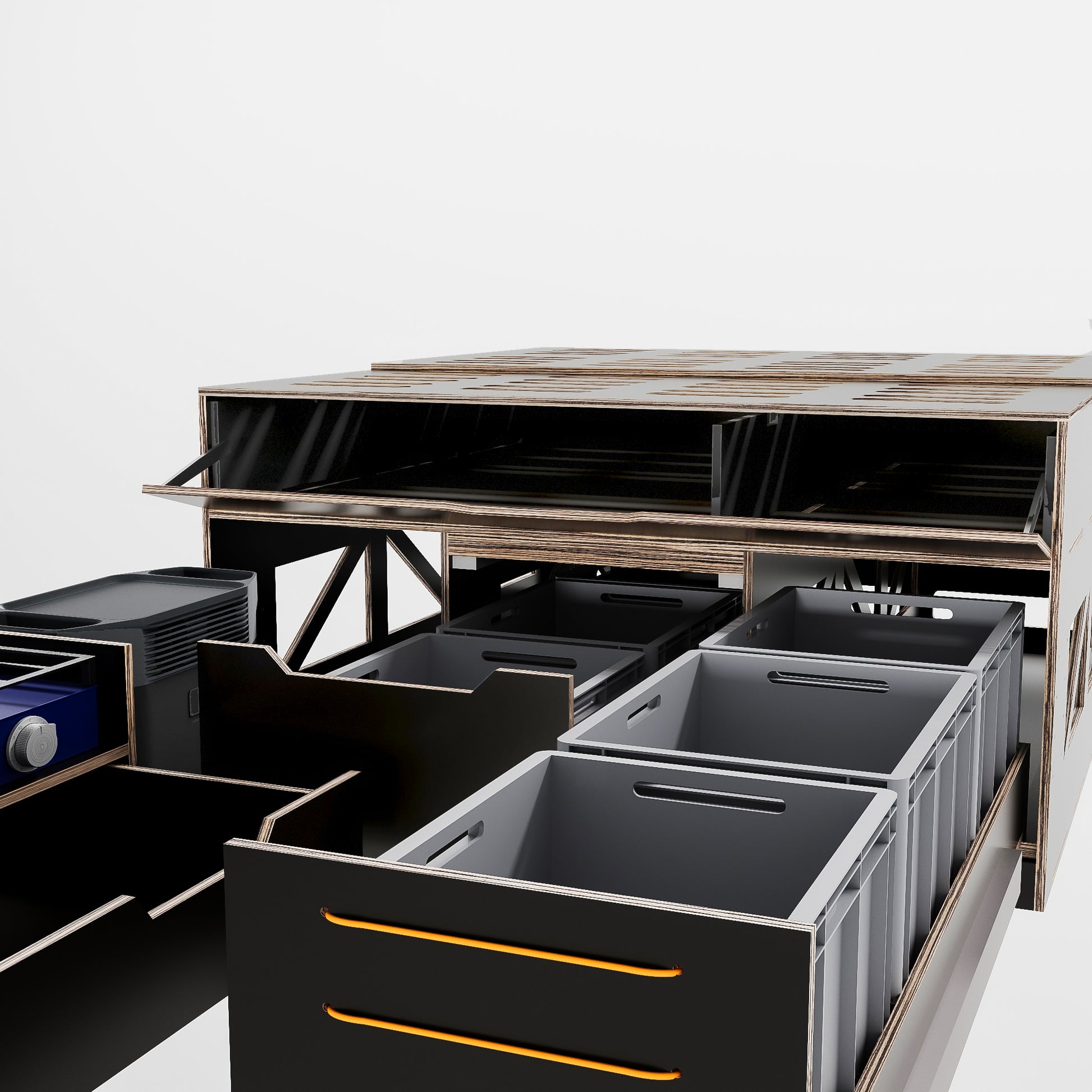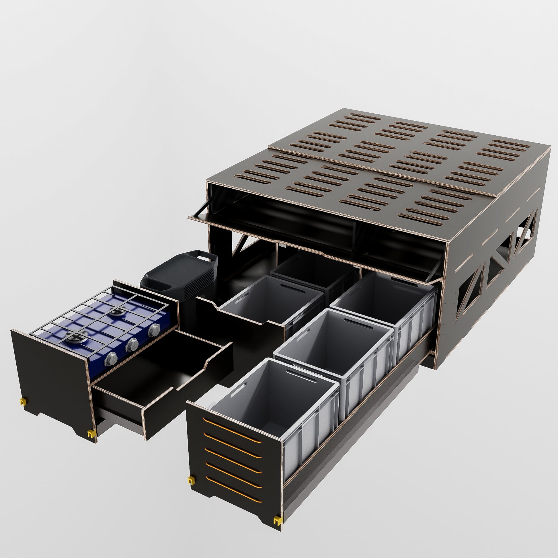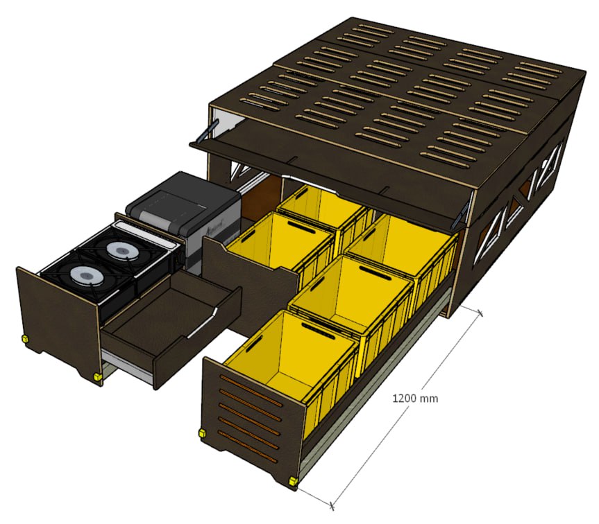 🔹 Funktionalität: Ausgestattet mit praktischen Auszügen, Stauraum, einer Kochzone und einer ebenen Schlafplattform – alles Wichtige immer griffbereit!