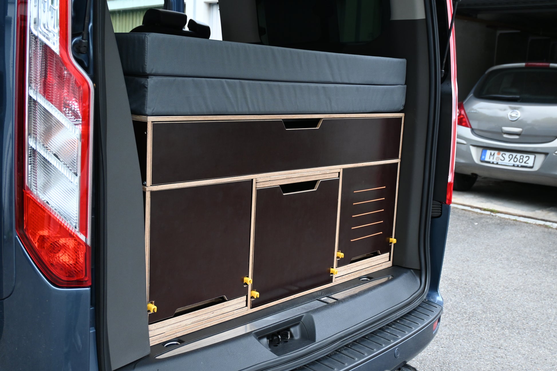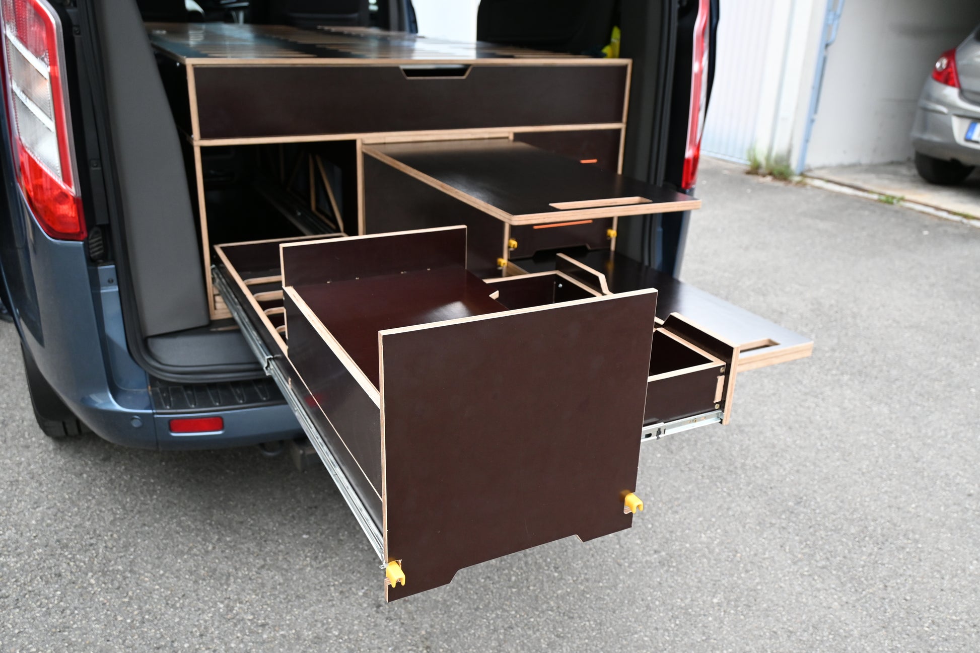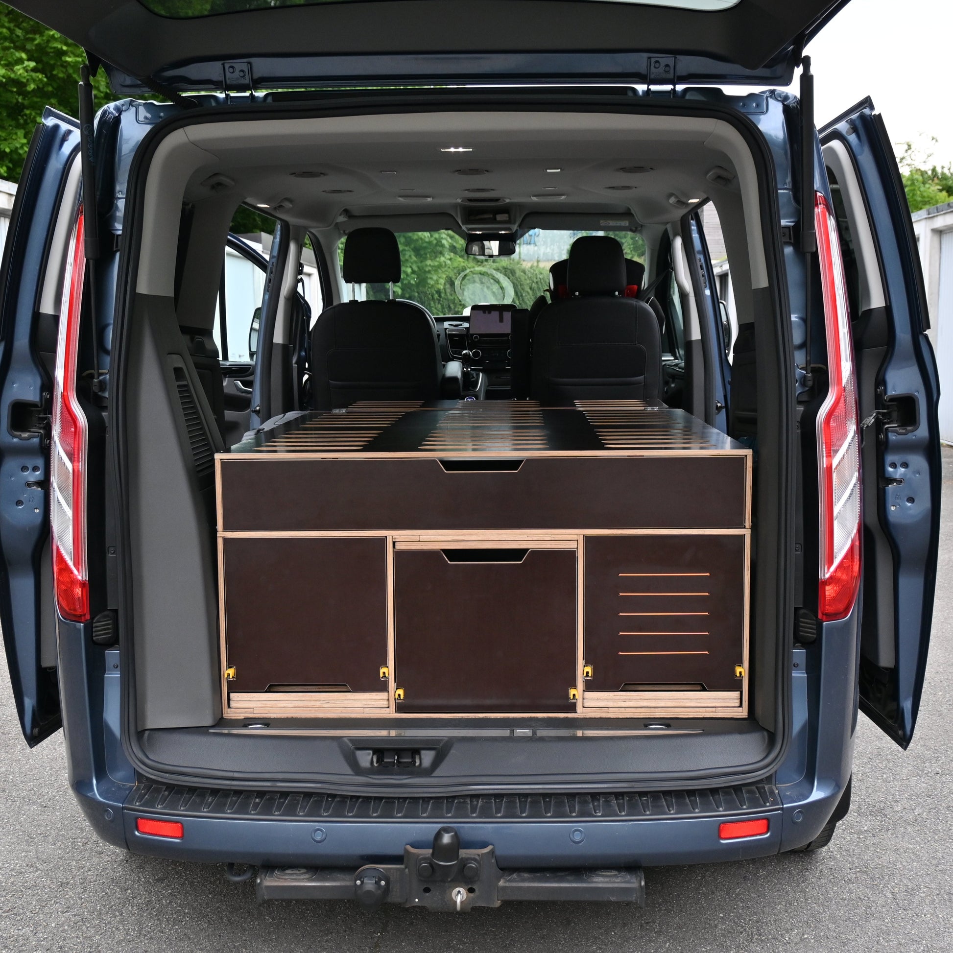 🔹 Vielseitigkeit: Speziell für den Ford Tourneo Custom entwickelt – das Modul passt perfekt in den Kofferraum und ist mit den Sitzen kompatibel, ganz ohne Ausbau.