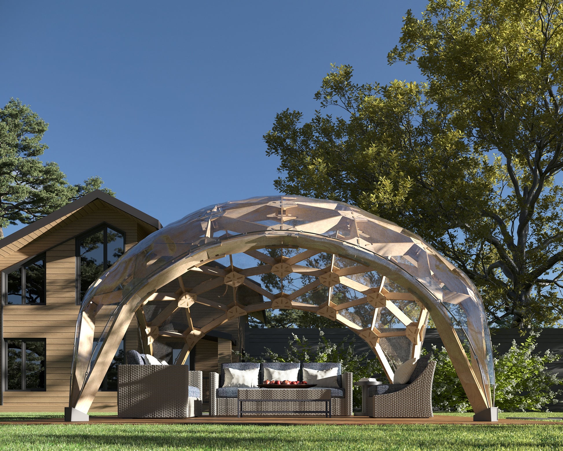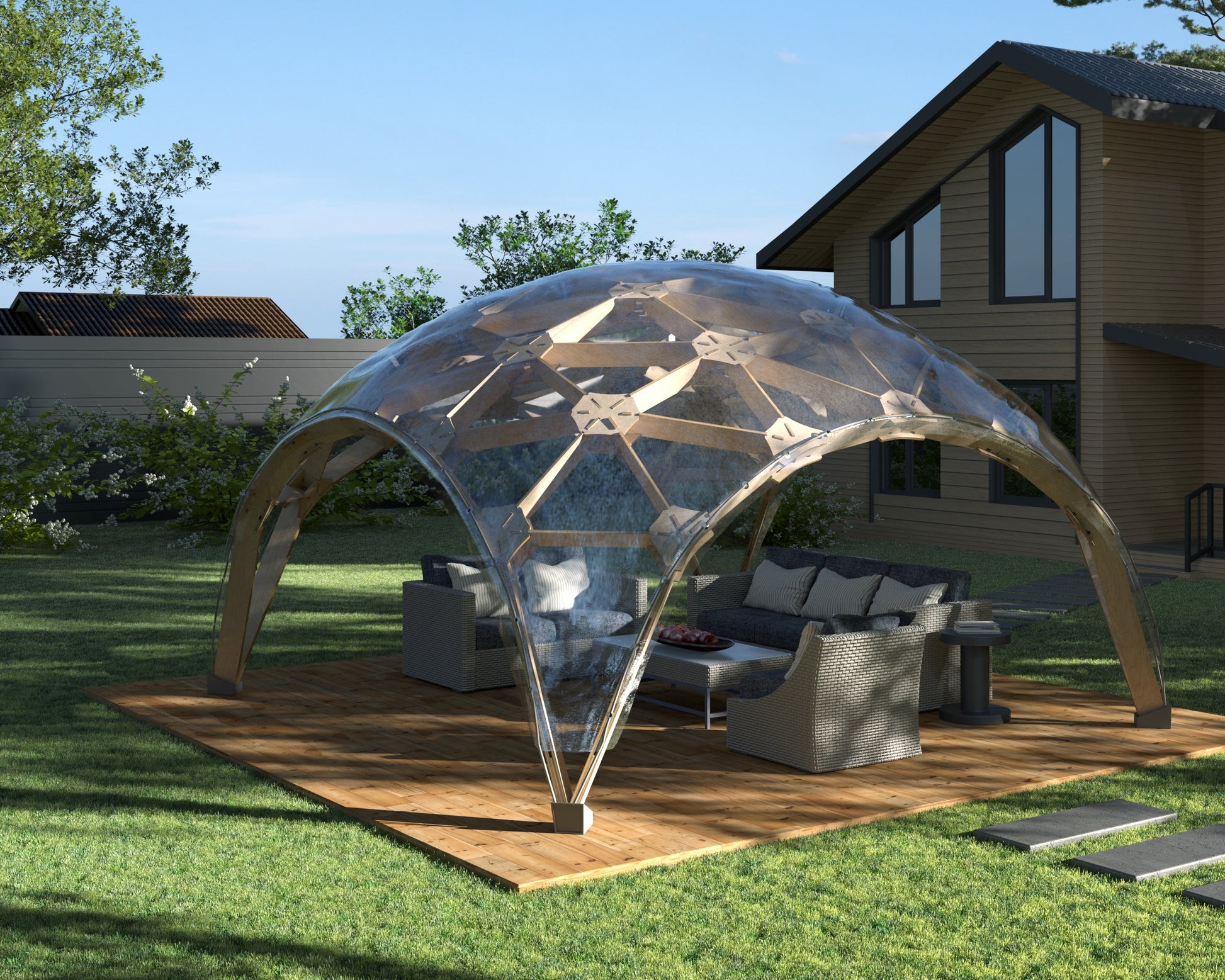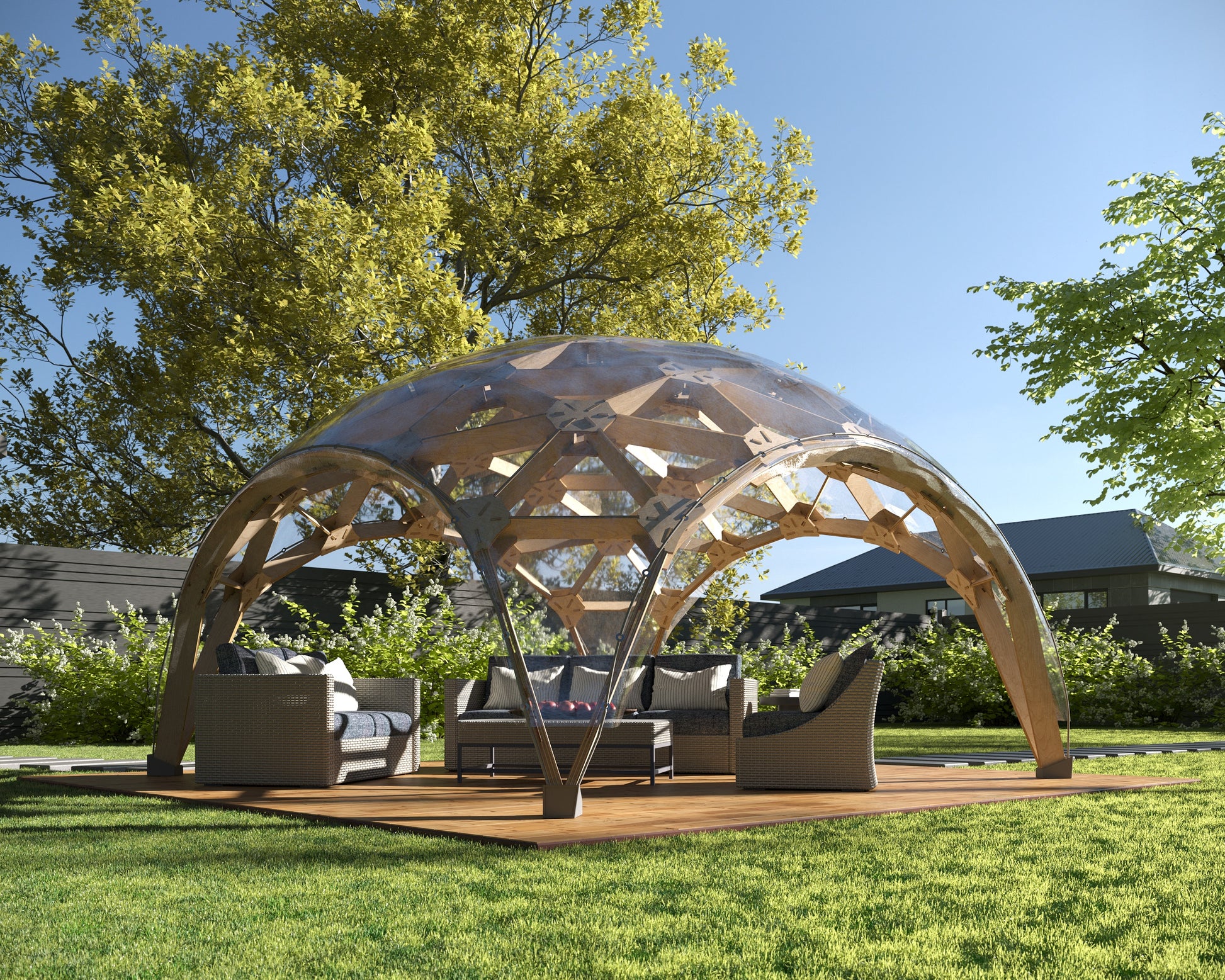Diese moderne Outdoor-Struktur verbindet technische Präzision mit einem leichten, offenen Erscheinungsbild. Die Konstruktion basiert auf 18-mm-Sperrholz aus Nadelholz, das zu einem stabilen Traggerüst geformt wird. Darüber spannt sich eine transparente Schicht aus Polycarbonat, die die Kuppel schützt, ohne sie optisch zu beschweren.