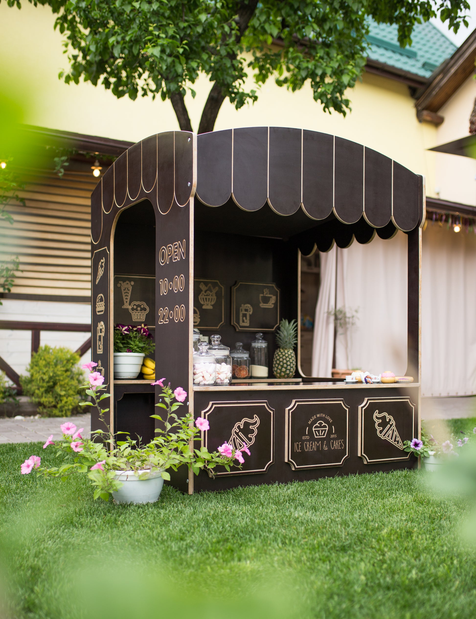 Stylisch, modern und äußerst langlebig – dieser Spielkiosk ist ideal für Kindergärten, Gärten, Spielzimmer oder Familienfeste. Das Design erinnert an ein echtes kleines Café oder eine Eisdiele und lädt Kinder dazu ein, in eine kreative Rollenspielwelt einzutauchen.